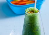 Descasque a banana e coloque todos os ingredientes num liquidificador até obter uma mistura consistente.