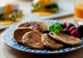 Sirva as panquecas com mel por cima e as frutas vermelhas como acompanhamento.